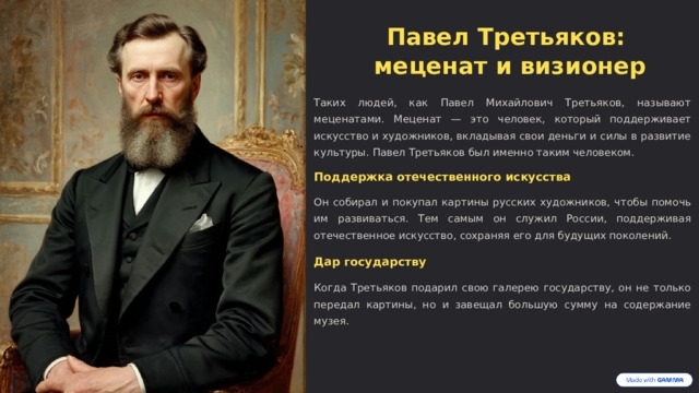 поддерживали их финансово, помогали семьям живописцев и внесли огромный вклад в популяризацию русского изобразительного искусства. В течение 40 лет Павел Третьяков собирал коллекцию картин, особое место среди которых занимала портретная галерея выдающихся деятелей русской культуры — композиторов, писателей, художников. Так Третьяков стремился сохранить память о них и их вкладе в развитие отечественной культуры. В 1892 году Третьяков передал в дар городу Москве не только коллекцию картин, но и дом со всеми пристройками. За собой он оставил право пополнять коллекцию новыми произведениями искусства. Их семейная коллекция со временем стала национальным сокровищем, которое сейчас знает каждый.